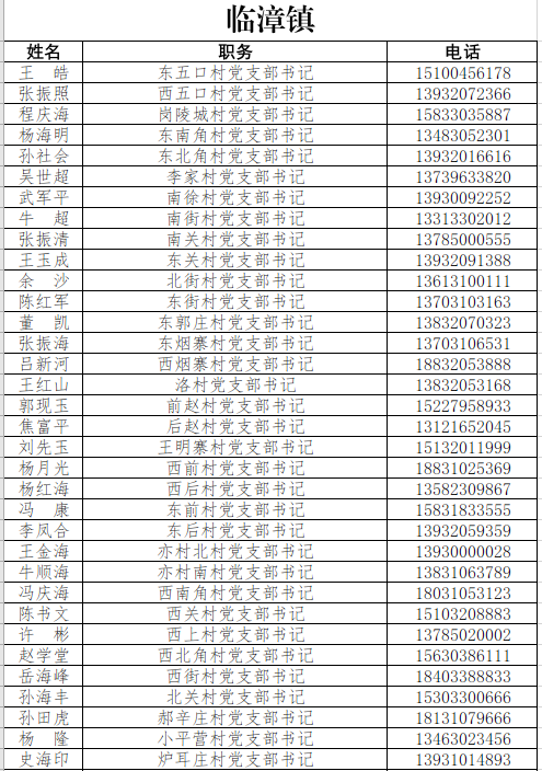 临漳县政府“各级、乡镇书记”名单及联系方式公示
